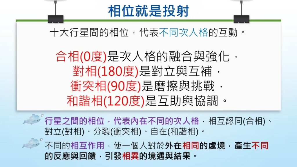 一切都是自我內在模式的一種投射,不同相位代表一個人對外界同一人事物,與生俱來的不同投射模式。每個人在出生之前,靈性意識都選擇了不同的投射模式,來學習、體驗與創造,此生獨一無二的生命歷程!